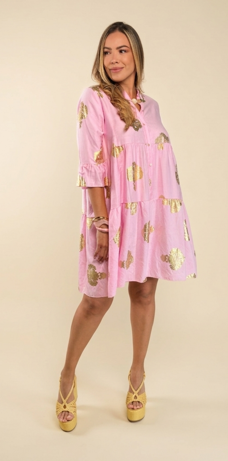 Tiered Buttoned Mini Dress with Gold Foil