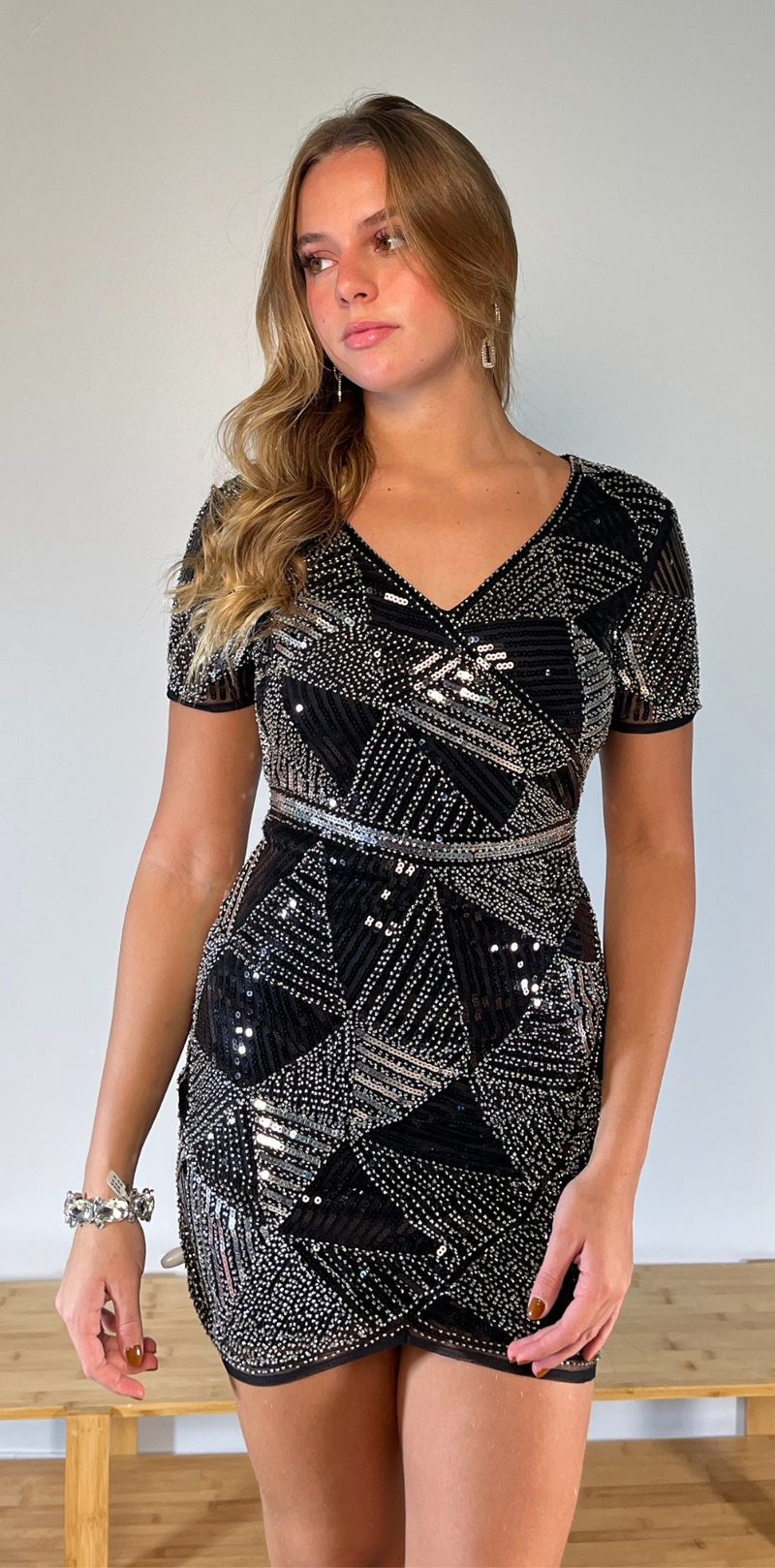 Black Geometric Sequin Wrap Mini Dress