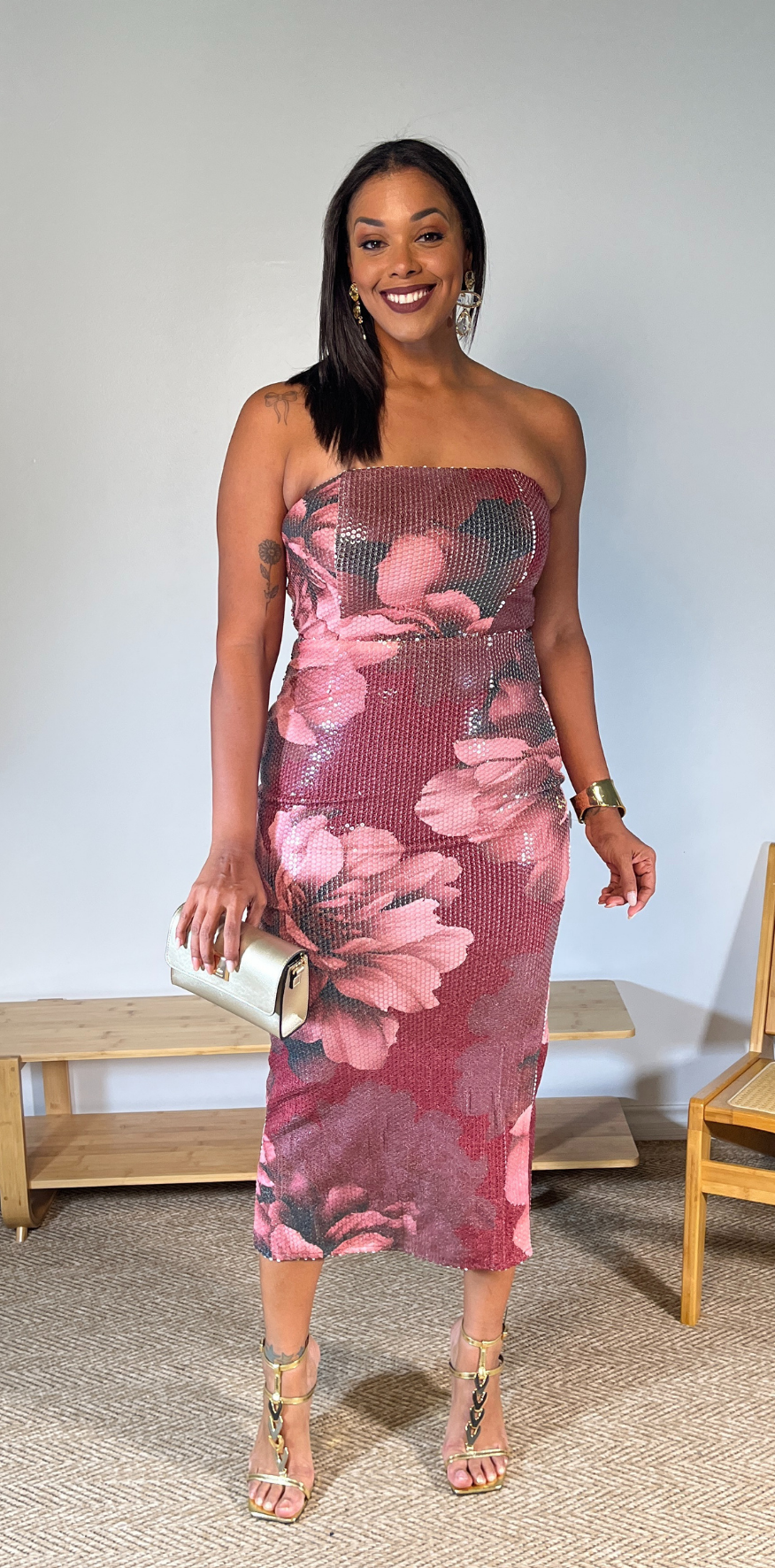 Mauve Floral Sequin Strapless Dress