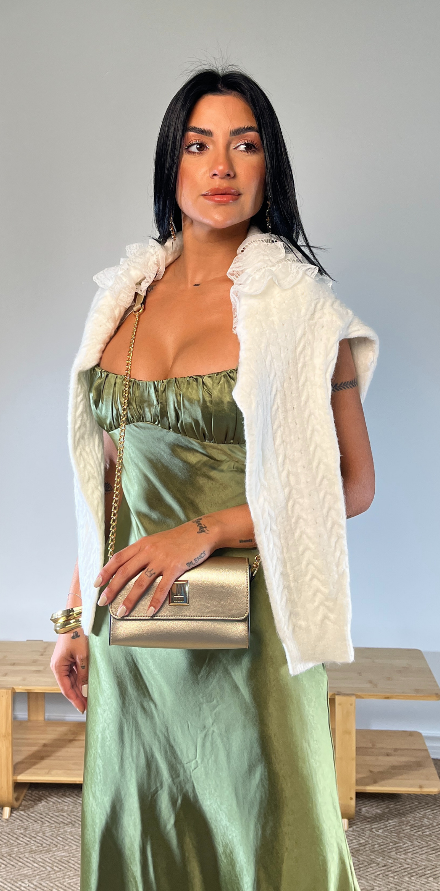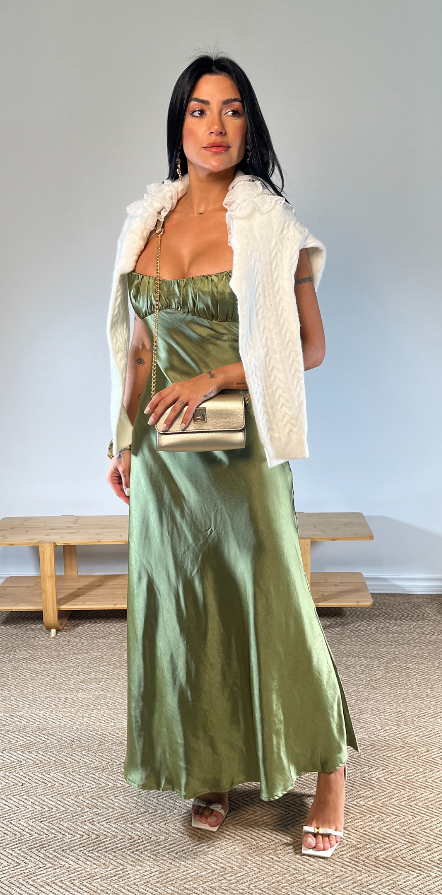 Olive Green Spaghetti Strap Satin Dress