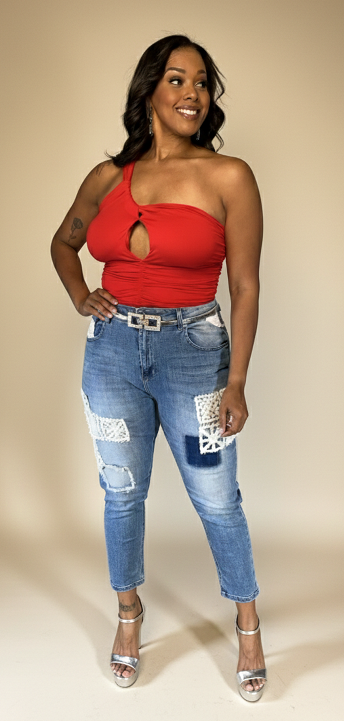 Crochet patches blue jeans. Price: AWG 145,- / USD 83