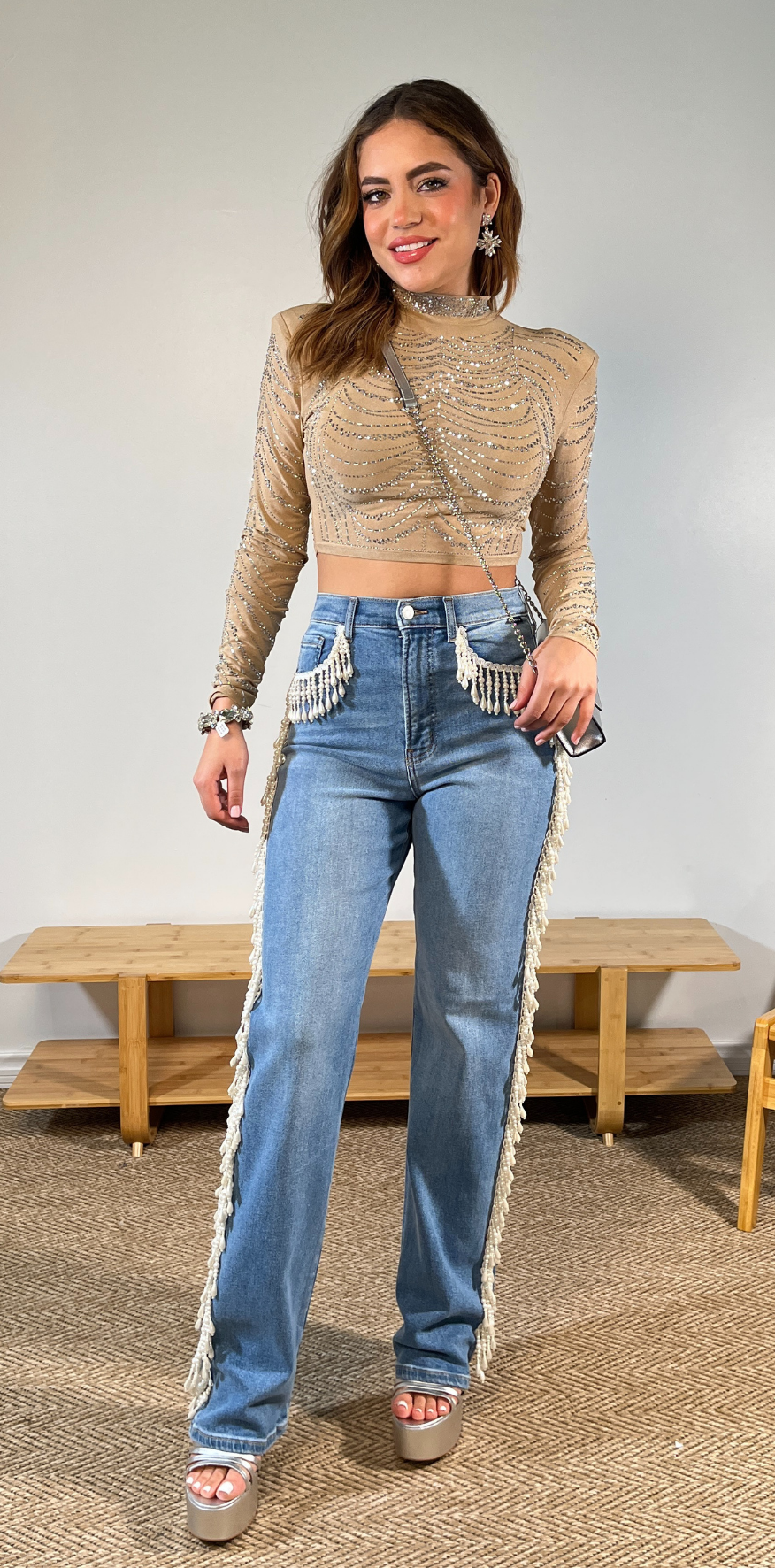White fringed blue jeans. Price: AWG 225,- / USD 129
