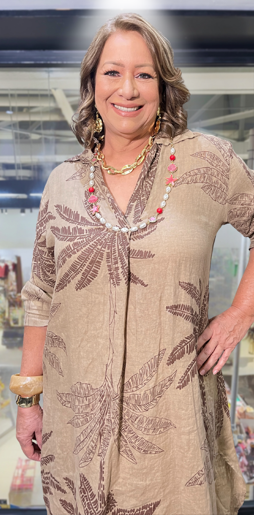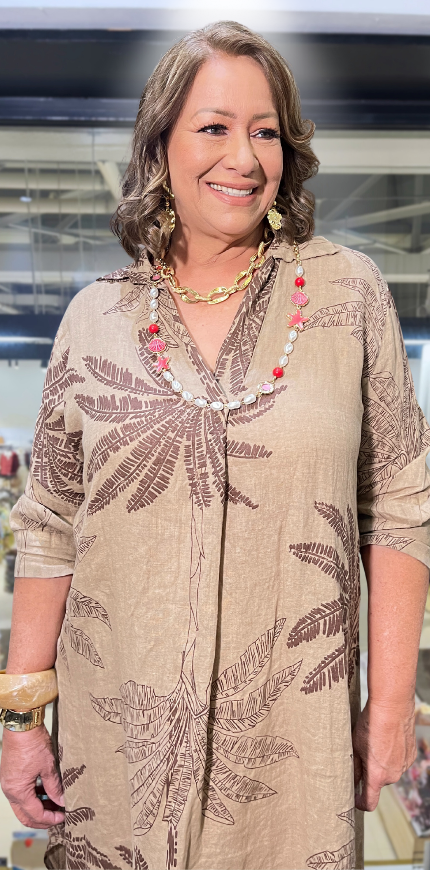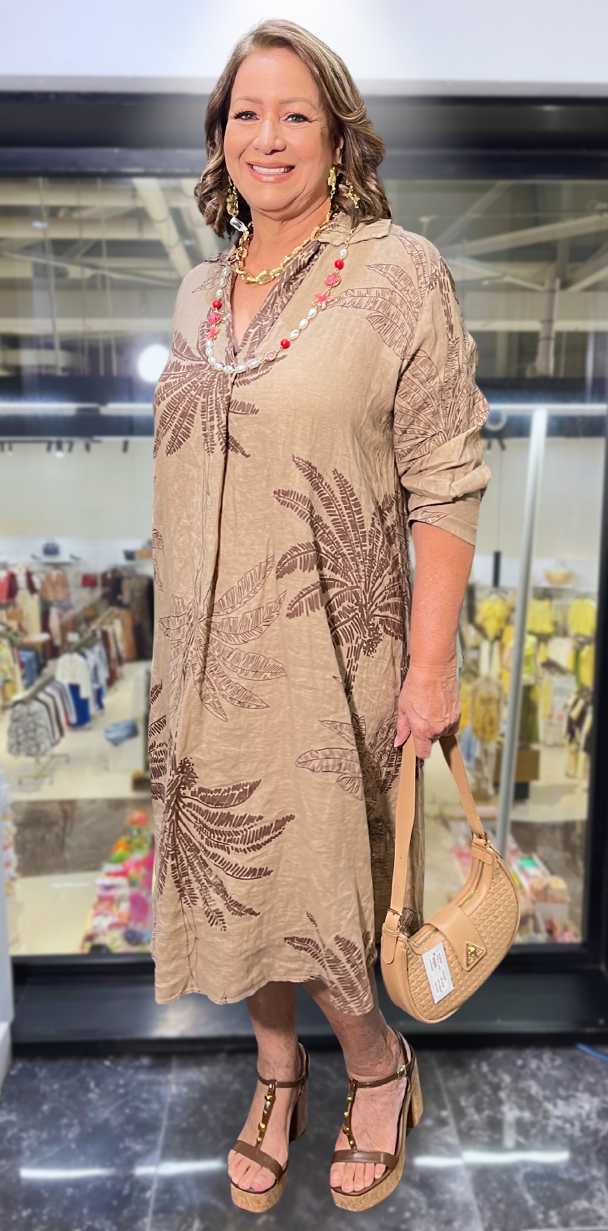 Beige Palm Print Lino Dress.